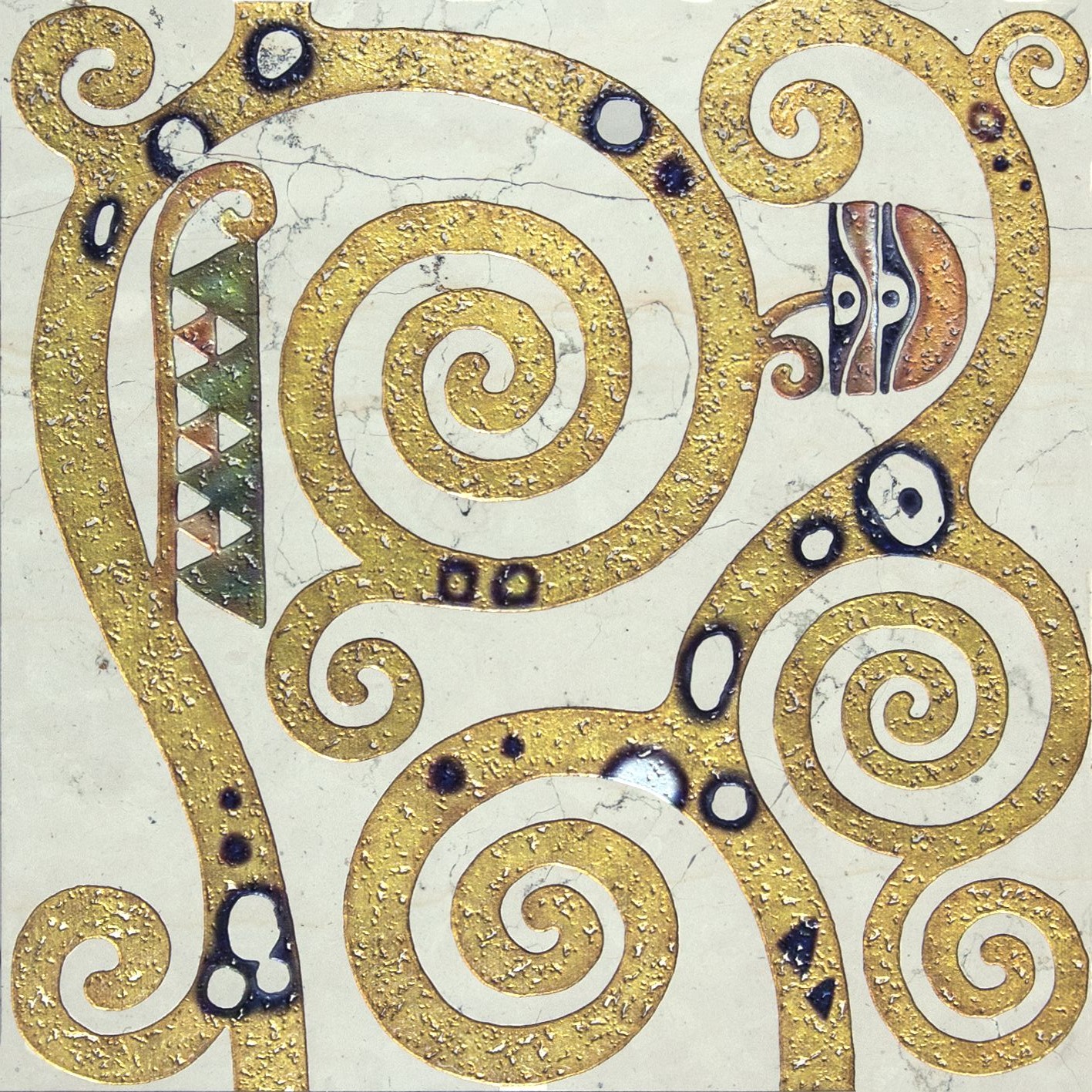 KLIMT INSPIRATION THE KISS PANELcm 100x140x1 Rielaborazione su marmo biancone acidato, metallizzato composto da 2 pc cm 70x100x1 TREE OF LIFECm 40x40x1 Biancone, metallizzato THE KISScm 40x40x1 biancone, metallizzato
