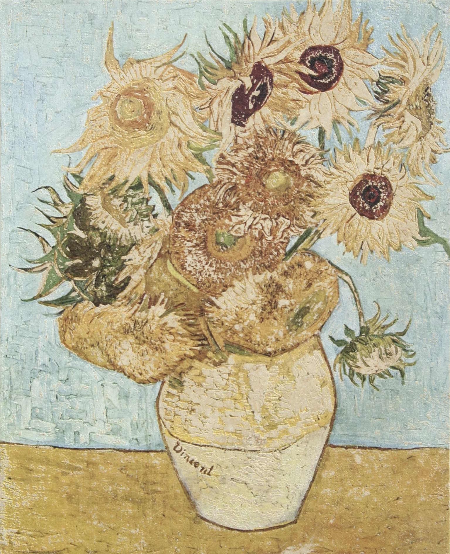 VAN GOGH INSPIRATION SUNFLOWERS PANELCm 80x100x1 Rielaborazione su marmo Giallo Atlantide acidato,decorato ALMOND BLOSSOMCm 40x40x1 Biancone SUNFLOWERSCm 40x40x1 Giallo Atlantide